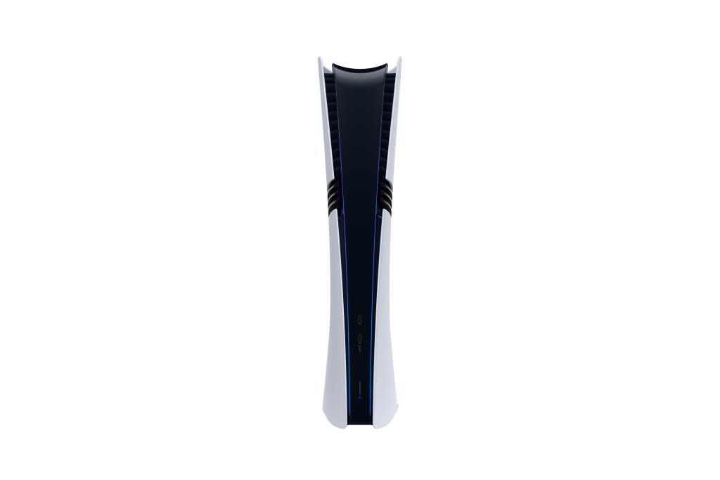 La PS5 Pro mantiene la estética futurista de la familia PS5 en color blanco, pero con un diseño renovado y dimensiones ligeramente diferentes (388 x 89 x 216 mm) para albergar su hardware mejorado. Con un peso de solo 3.1 kg (la consola en sí), es más ligera de lo que aparenta. Incluye pies de soporte para colocación horizontal y es compatible con los mismos accesorios de la PS5 estándar, como el soporte vertical (vendido por separado).
